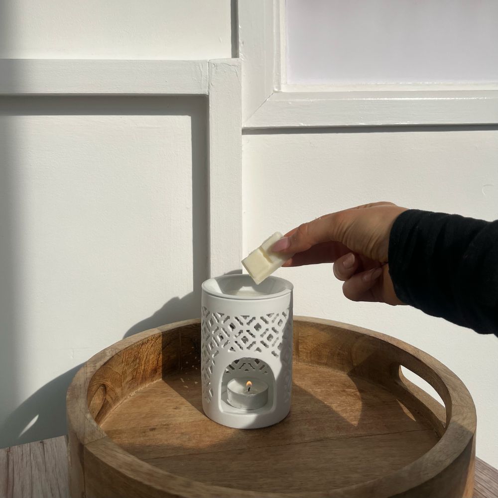 Now it's time to get melting. Place your wax melt segment into the dish of your wax warmer. If you're using an electric wax warmer, turn it on and let it work its magic. If you're using a tealight wax burner, light a tealight underneath and let the flame melt the wax. We recommend using a 40w electric wax warmer or a tealight wax burner with 4 hour tealight for best results. Never use an 8 hour tealight.